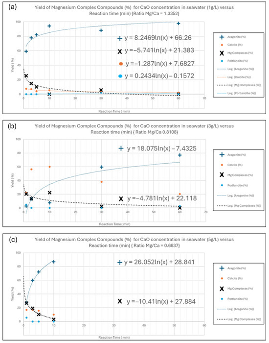 With reference to the trend shown in Figure 7a–c, the yield of magnesium-based compounds reduced drastically in a logarithmic down-trending after the initial 5 min reaction time for all cases of lime or CaO concentrations in seawater. The yield of magnesium-based compounds is between 20.3% to 26.7% in the first minute of reaction time. The trend appears to be in reciprocation to aragonite yield. For concentrations of CaO of 3 g/L and 5 g/L in seawater, there appeared to be higher concentrations of portlandite or unreacted CaO at 4.8% and 5.6% at the first minute of reaction due to the incomplete CO2 carbonation reaction. Higher calcite levels existing in the first minute for lower Mg/Ca ratios at Ca/Mg of 3 g/L and 5 g/L are also in line with the hypothesis pointed out again, by Bischoff and Fyfe, 1968 [53]; Berner, 1975 [54]; Fernández-Díaz et al., 1996 [55] and De Choudens-Sánchez [56] in which magnesium adsorbed on the surface of calcite seedings to inhibit its further growth. Consequently, we shall see lower calcite yield in the first case [CaO] = 1 g/L or a ratio of Mg/Ca = 1.3353 as more magnesium is able to inhibit calcite crystalline growth. A rule of thumb is proposed here to maximize magnesium compounds yield, which is foremost, to prematurely quench or stop the seawater mineral carbonation at the very beginning of the reaction, which in this case is between 1 min and 5 min to ensure all portlandite reacts with CO2 gas to form calcite seeds subsequently allowing magnesium to adsorb and form complexes on the surface of calcite. Secondly, we kept the ratio of Mg/Ca or concentration of CaO in 33 g/L seawater blends less than 1 g/L or Mg/Ca < 1.3352 to ensure recovery of magnesium is maximized, and finally maintained the temperature at room temperature to ensure that CO2 dissolution is effective to supply the mineral carbonation reaction. Extrapolation of the trending lines in Figure 7a–c pertaining to the magnesium-based compounds yield was performed to estimate the potential yield at 0+ minutes or 30 s reaction time. The trending lines, as extrapolated, showed the highest increase in the magnesium-based compounds precipitation for the case of CaO concentration in seawater at 5 g/L or Mg/Ca = 0.6637, where potential yields were in the range of 50% at 0.5 min or 30 s.