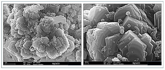 Previous work by Santoro De Vico et al. (2024) [59], Santos et al. (2023) [60], and De Choudens-Sanchez (2007) [56] also supports the findings above. Furthering the argument, Santoro et al. [59] described the formation of amorphous magnesium carbonate (AMC) as a transient early-stage magnesium carbonate mineralization where the reaction system undergoes a liquid–liquid separation before solid formation, resulting in amorphous and irregular morphologies, while [60] highlighted that hydrated magnesium carbonates tend to be poorly crystalline or amorphous in nature due to kinetic barriers in Mg2+ dehydration. These irregular aggregates are associated with low saturation states and early nucleation, often preceding the formation of more defined polymorphs like calcite or dolomite [61].