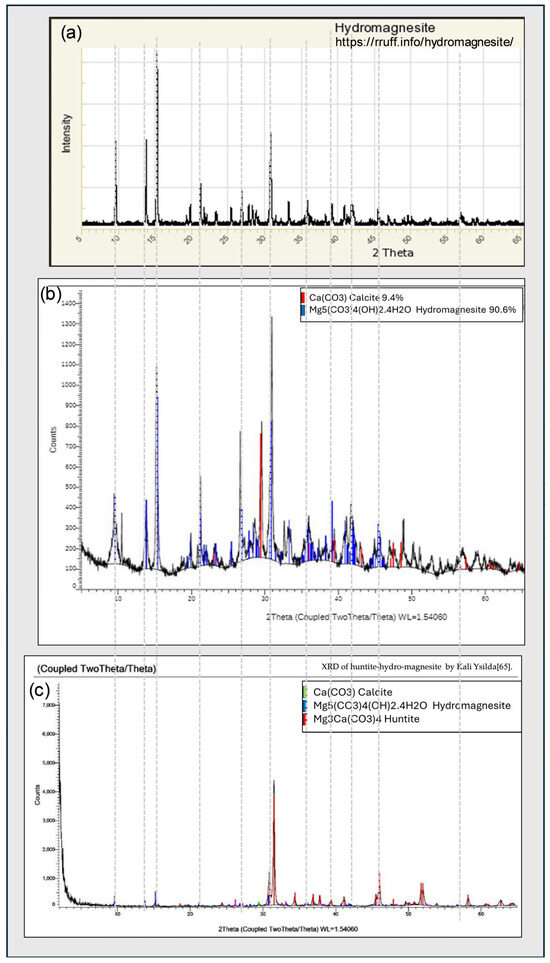 The hydro magnesite, which has the chemical compound formula of Mg5(CO3)4(OH)2 • 4H2O according to Mineral Data Publishing [62], was subjected to an X-Ray diffraction test provided via Bruker D-8 with library standard matching/interpretations. XRD pattern obtained from the 5000 g products synthesized has a dominant crystallography property matching that of hydro magnesite and calcite, as shown in Figure 9a, according to the interpretation library installed. The hydro magnesite X-Ray diffractograms above are also comparatively similar to the crystallography database of the previous work of researchers such as RRUFF’s American Mineralogy Database [63] in Figure 9b, Akao M et al. (1977) [64], and characterization work on huntite–hydro magnesite geological mineral by Kali Ysilda (2021) [65] as shown Figure 9c. The presence of calcite is due to the quick reaction quenching time at 30 s is in line with the previous results obtained—16.8% of calcite yield detected in Figure 9c when the reaction was quenched at 1 min reaction time.