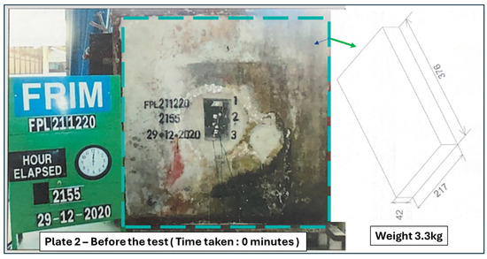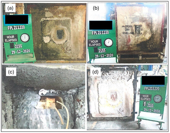 The testing was stopped at the 104th minute when the early signs of integrity and insulation failure were observed, when a small hole appeared on top of the block sample at 100 min. The visuals of the installation of the magnesium-rich test block are shown as in Figure 13a—before the test, Figure 13b—at 60 min, and Figure 13c—after the test was stopped at 104 min for visual comparison.