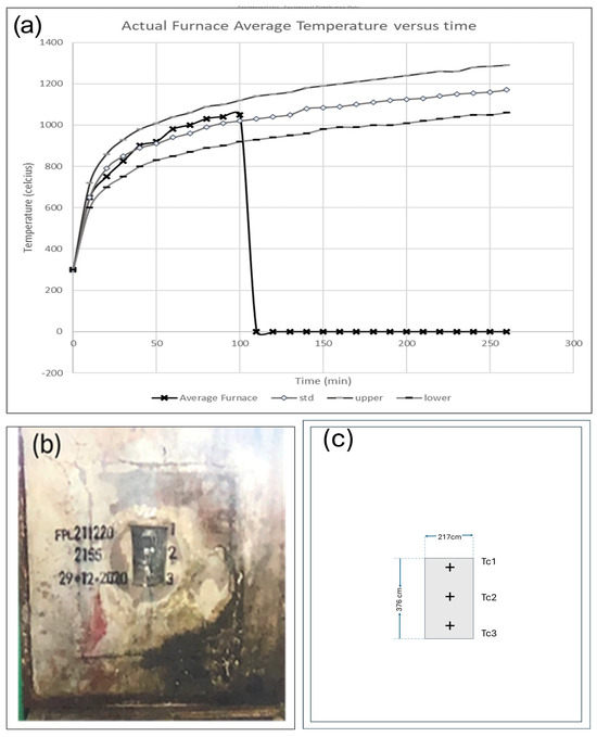 (a)—Results of the actual furnace temperature time curve; (b) the actual thermocouple TC1, TC2, and TC3 position, and (c) diagram of the thermocouple position during construction.