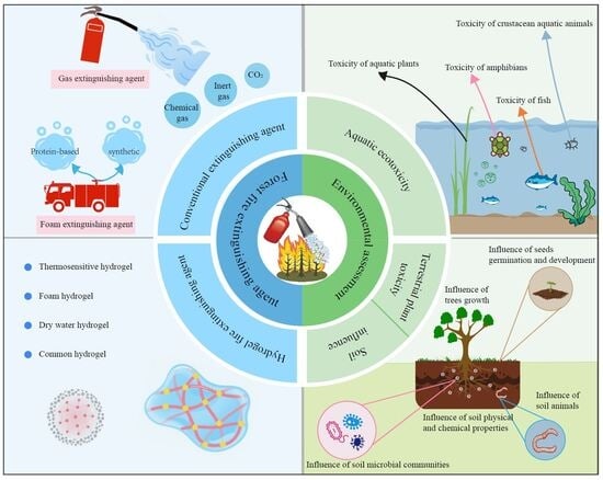 In the context of climate change, increasingly severe forest fires present a significant threat to lives, property, ecosystem functionality, and the sustainable development of forest resources. As a result, there is an urgent need for rapid, efficient, and environmentally friendly technologies for fire suppression and containment. This paper begins by reviewing the current research on forest fire extinguishing agents and materials that hold promise for effective fire suppression. Among these agents, gaseous and foam extinguishing materials exhibit drawbacks such as low efficiency or significant environmental hazards. In contrast, natural polymer hydrogels, which are high in water content, environmentally friendly, and biodegradable, show significant potential for developing clean and efficient extinguishing materials. Furthermore, this paper discusses existing environmental assessment standards for fire extinguishing agents, as well as the assessment systems proposed in various studies. It finds that, while universal assessment standards are fairly well-established, current research primarily focuses on enhancing fire suppression performance. However, the environmental performance assessment of forest fire extinguishing agents—often used in large quantities—remains inadequate. Therefore, there is an urgent need to establish a comprehensive and systematic environmental assessment system to address this theoretical and practical gap. Full article