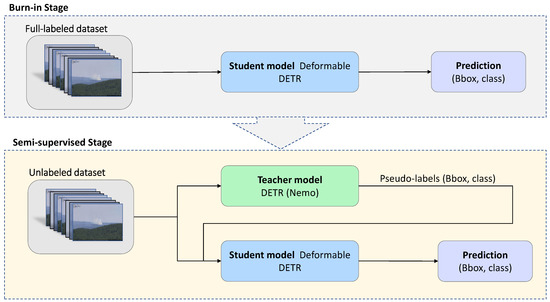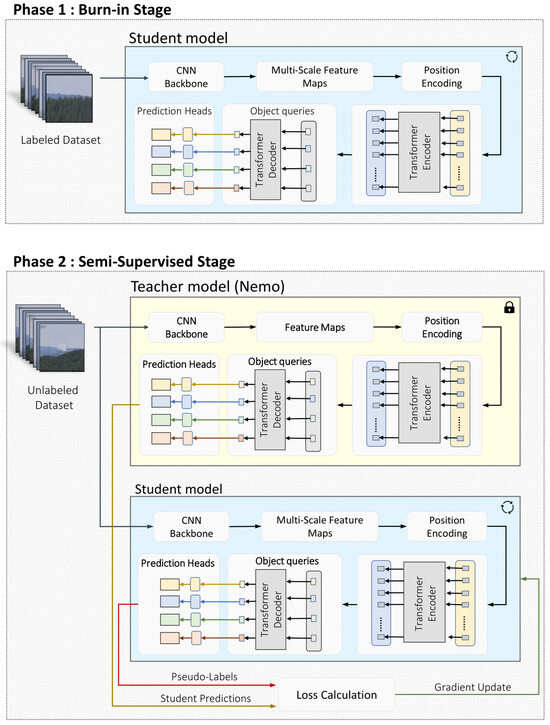 Overview of the proposed two-stage training framework. In the burn-in stage, the student model, based on Deformable-DETR, is trained on labeled data to establish a baseline. In the semi-supervised stage, a fixed pre-trained teacher model (Nemo), built on standard DETR, generates pseudo-labels for unlabeled images. The student is updated by minimizing the loss between its predictions and the teacher’s outputs, enabling knowledge transfer using unlabeled data.