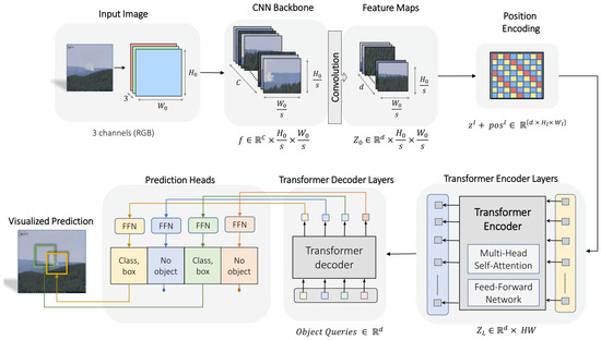Figure 2 illustrates the DETR framework, which is built around three key modules: a convolutional backbone, a Transformer encoder–decoder, and a feed-forward network (FFN). The process begins by passing the input image through the CNN backbone to extract a low-resolution feature representation. This representation is flattened, enriched with positional encodings to retain spatial structure, and then delivered to the Transformer encoder. By applying multiple layers of Multi-Head Self-Attention, the encoder captures global dependencies across the image and models the interactions among different regions effectively.
