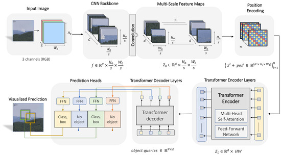- Carion, N.; Massa, F.; Synnaeve, G.; Usunier, N.; Kirillov, A.; Zagoruyko, S. End-to-end object detection with transformers. In Proceedings of the European Conference on Computer Vision, Glasgow, UK, 23–28 August 2020; Springer: Berlin/Heidelberg, Germany, 2020; pp. 213–229. [Google Scholar]
