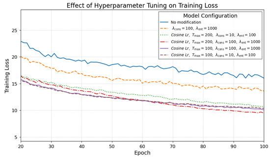 To establish an optimal training configuration for our framework, we conducted a rigorous sensitivity analysis of the most influential hyperparameters. The primary objectives were to accelerate model convergence, enhance training stability, and achieve a lower final loss value. Our optimization efforts centered on the loss-weighting coefficients, and (from Equation (1)), and the primary parameter of the cosine annealing scheduler, the decay period (from Equation (6)). We employed a grid search to explore various combinations of these parameters.