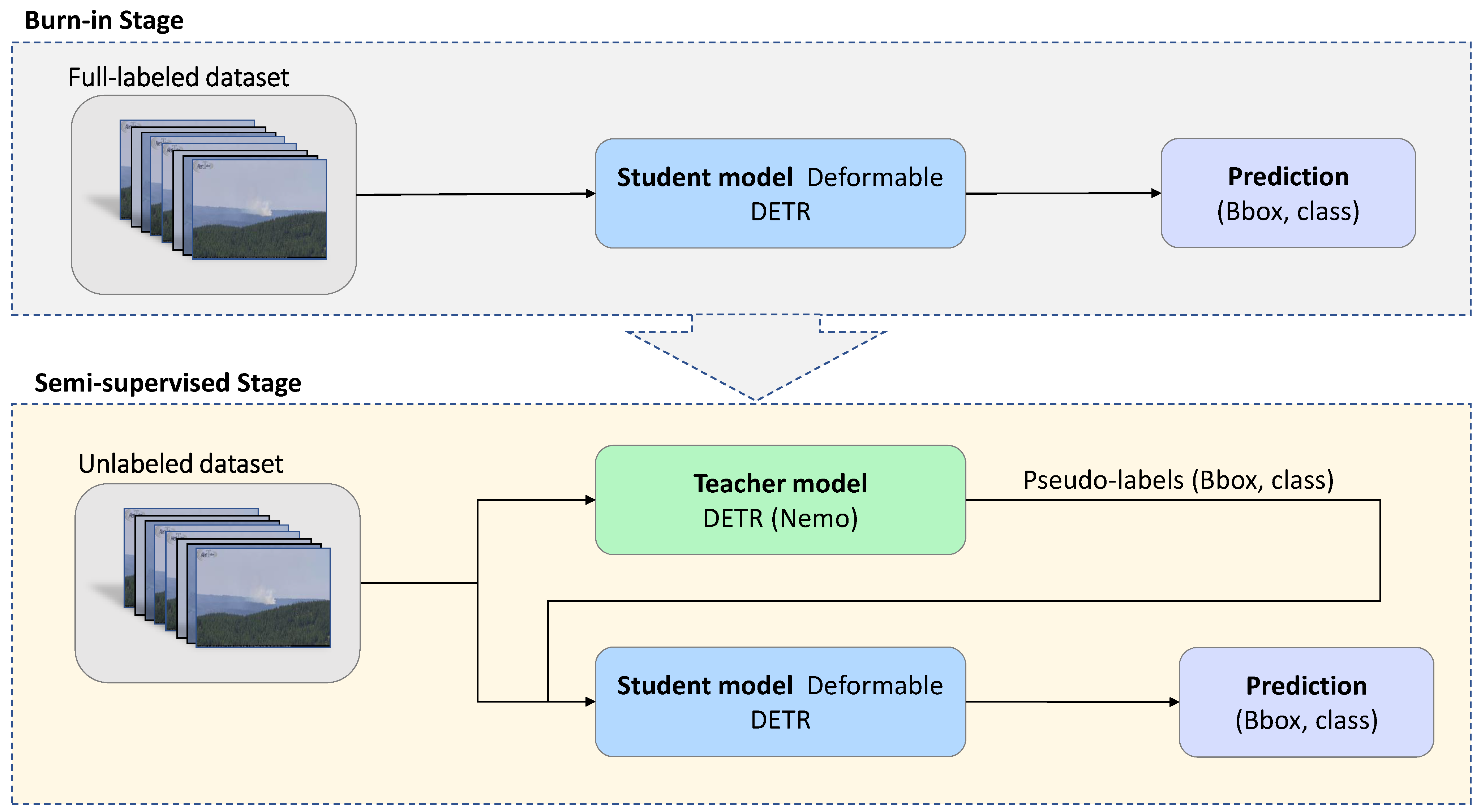 - Stage 1 (Burn-In Training): In the first phase, the student model is trained on the Nemo training set, which consists of 2400 fully labeled wildfire images collected before 2020 from the AlertWildfire network. This dataset, identical to the one used for training the original Nemo teacher model [24], provides full supervision and establishes the foundation for initializing the student.