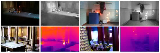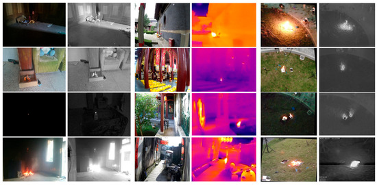 To thoroughly validate the model’s multimodal fire saliency detection capabilities in outdoor environments, we employed the RGB-T wildfire dataset proposed in Reference [4]. This dataset is pre-aligned. To further assess the model’s performance on misaligned modalities, we introduced random affine transformations to the RGB-T wildfire data, simulating modality misalignment. Prior to model input, images were uniformly resized to 480 × 480. Data augmentation strategies, including flipping and rotation, were applied during training. A partial visualization of the training dataset is presented in Figure 7.