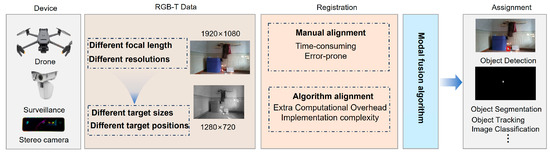 This misalignment directly compromises the accuracy of subsequent multimodal feature fusion and fire detection. The current multimodal detection workflow is schematically represented in Figure 3. Presently, fire detection research primarily focuses on developing effective RGB-TIR fusion methodologies, while comparatively limited attention has been devoted to addressing data misalignment issues in real-world acquisitions. This knowledge gap poses significant challenges for practical fire monitoring applications.