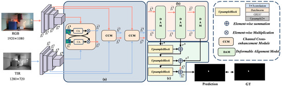 Figure 4. Overall architecture of the proposed method for fire detection with multimodal fusion under unalignment: (a) Channel Cross-Enhancement Module (CCM); (b) Deformable Alignment Module (DAM); (c) UpsampleBlock module.