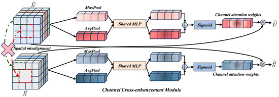 Current multimodal fusion approaches can generally be categorized into pre-fusion, intermediate fusion, and post-fusion strategies. Among them, intermediate fusion architectures are the most widely adopted, as they allow for staged feature interaction and dynamic weight adjustment, achieving a desirable balance between flexibility and robustness in multimodal tasks. In this paper, we employ an intermediate fusion strategy to integrate RGB and IR features across four hierarchical layers. To address the spatial misalignment [30] between the two modalities, we restrict feature interaction to the channel level, thereby avoiding the assumption of precise spatial alignment. This design significantly reduces computational complexity compared to Reference [21], which performs multi-step cross-attention for spatial feature interaction across modalities. Interaction in the spatial domain requires processing high-resolution feature maps, resulting in elevated computational cost—particularly with high-resolution inputs or deeper feature layers. Effective cross-modal fusion depends on mining semantic complementarity between modalities [31]. Since channel dimensions typically encode high-level semantic information, channel attention mechanisms can effectively capture inter-modal semantic associations by modeling relationships between channels, without requiring explicit spatial transformation. The corresponding computational process is described as follows: