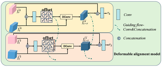 In the DAM module, enhanced features f ^ r i and f ^ t i are concatenated to form preliminary fusion features. A subsequent convolution operation then generates the offset, which can be formally described as: