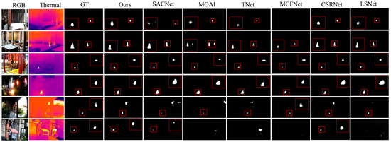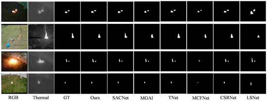 Among these, LSNet, CSRNet, MCFNet, TNet, MGAL, and SACNet are models that have demonstrated superior performance in RGB-T SOD tasks over the past three years. Notably, SACNet is specifically designed for handling misaligned data in SOD. Comparative experiments were conducted using the default parameters of these models.