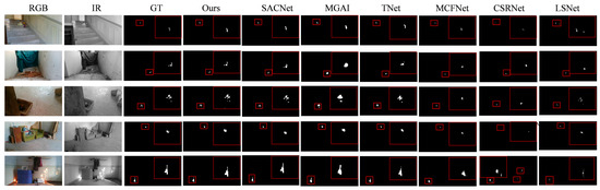 Figure 9 presents the visual comparison on the Indoor-Fire dataset. Due to the relatively small size of the fire targets, we performed target region magnification, with the red bounding box indicating the magnified target. Five representative results are selected, covering common indoor fire scenes, such as stairwells, corridors, living room sofas, and wooden tables. The first result demonstrates a fire in a stairwell, where the fire target in the IR spectrum is more clearly defined than in the RGB spectrum, showing that our method provides better fire region prediction coverage than other models. A comparison with SACNet reveals that SACNet outperforms our method in some cases. For instance, in the third set of results, our model misjudged the fire region due to the absence of complex spatial cross-calculations. However, this issue does not occur in all data; in the other four sets of results, our predictions are highly consistent with the ground truth.