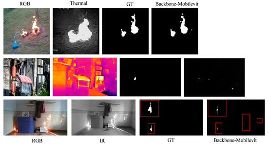 Furthermore, our method’s evaluation performance on the Indoor-Fire dataset is slightly inferior to SACNet. By analyzing the data with relatively lower evaluation metrics, we found that the SACNet model uses complex multi-head cross-attention [30] computation in its feature interaction module. Additionally, we employed Swin-Transformer as the backbone network for SACNet and observed that its performance yields better evaluation metrics compared to using Res2Net50. This improvement is due to Swin-Transformer’s strong global modeling capability, which excels in feature extraction, particularly for small target flames in the Indoor-Fire dataset. However, Swin-B has nearly four times the number of parameters as Res2Net50. Considering the real-time detection requirements for fire detection, we decided not to use Swin-Transformer as the backbone network. In our ablation studies, we compared MobileViT, a backbone network with fewer parameters, which combines the local feature extraction capabilities of CNNs and the global modeling capabilities of Transformers, to explore the impact of smaller backbone networks on model performance.