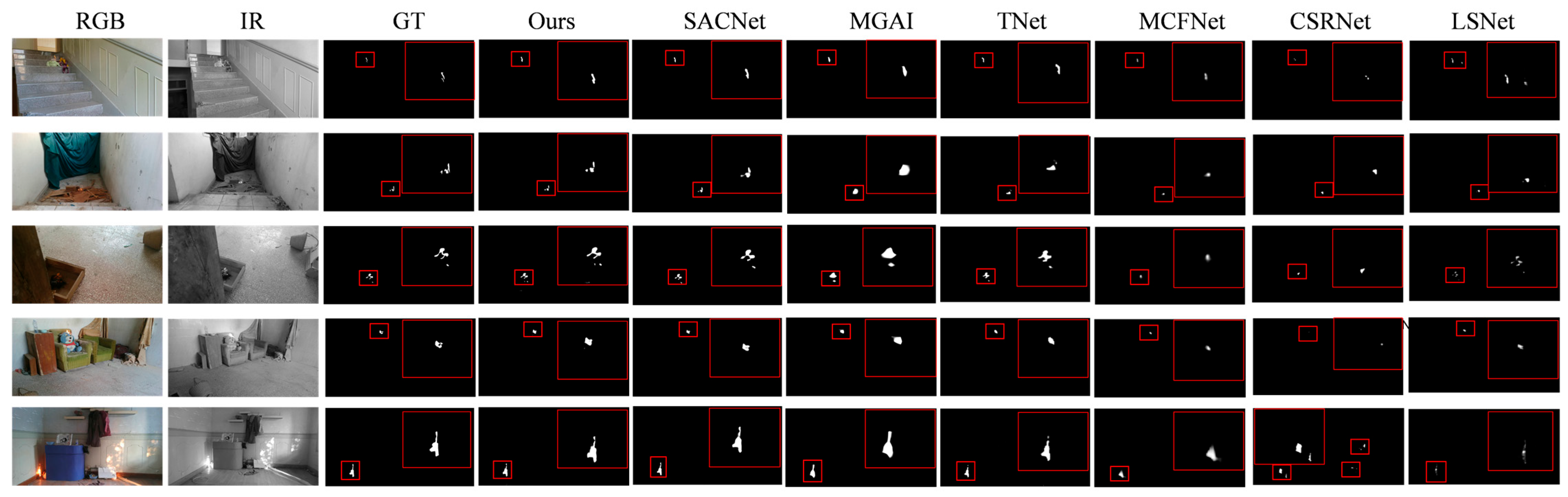 - To validate method efficacy, we conduct extensive experiments using the proposed misaligned multimodal fire dataset across indoor and cross-environmental scenarios. The results demonstrate superior performance over state-of-the-art RGB-T multimodal saliency detection models, confirming our method’s capability for accurate fire saliency detection with unregistered RGB and TIR inputs.