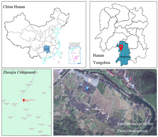 Zhoujia Compound, situated at the junction of plains and mountainous areas, is surrounded by the tributaries of the Xiang River and Xian Water, located in the warm temperate broadleaf forest zone with red soil. The climate features distinct seasons, with an average annual temperature ranging from 17.5 °C to 18.5 °C. The highest recorded temperature is 37.6 °C, while the lowest reaches −4 °C [28]. The frost-free period averages 285 to 329 days per year. Precipitation is abundant, with an average annual rainfall of 1360 to 1590 mm, and the rainy season spans from April to July. This area is part of China’s warm regions, featuring a climate that is mild, with short winters without severe cold and long summers without intense heat.