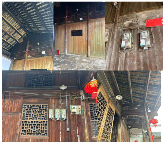 - Electrical equipment: In recent years, the number of fires traced back to the improper use of electrical equipment and disorderly cable wiring has been increasing. This rise is partly due to improved living standards, which have led to a significant increase in the use of electrical appliances. However, residents are not sufficiently familiar with the proper use of electrical equipment and lack the necessary fire safety awareness, which increases the likelihood of fire incidents caused by behaviors such as overloading power strips, using substandard wiring, or leaving appliances running unattended. Moreover, the initial design of Zhoujia Compound did not consider proper electrical wiring, resulting in common issues of improper wiring installations, which are often laid directly along flammable wooden structures and exposed, posing a severe fire risk once ignition occurs (Figure 5).