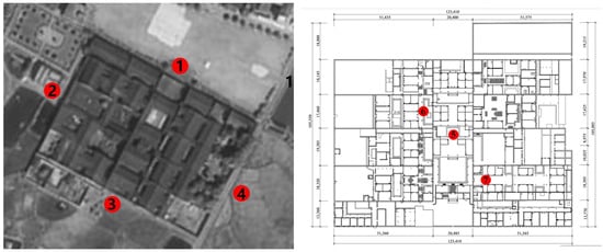 To accurately assess the influence of wind on fire propagation within Zhoujia Compound, we conducted a week-long field survey in January 2024. Using the Testo 425 handheld automatic detector, we strategically deployed the device at multiple monitoring points across the village and its surrounding open areas to capture real-time wind data. Different architectural units, depending on their positioning, compound size, form of enclosure, and orientation, exhibited varying wind speeds. The data collected from two selected units, whose measurement locations are shown in Figure 6, were cross-referenced with historical meteorological records from the nearest weather station to ensure consistency. Furthermore, to standardize our approach and minimize external influence on wind patterns, we utilized the guidelines provided in the National Building Climate Design Code (GB 50176-2016), ensuring that the wind speed ranges used in the simulations were representative of the local environmental conditions [33].