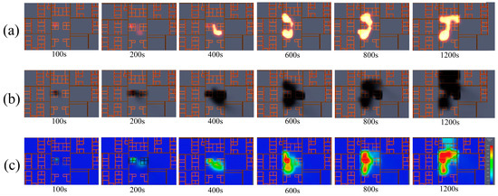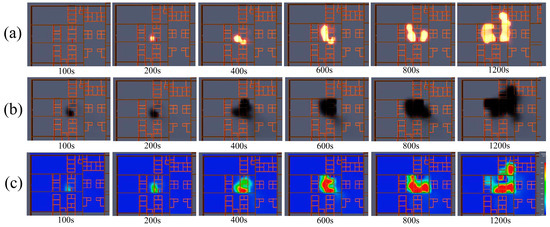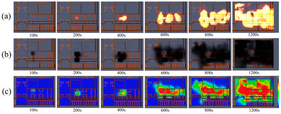 (a) Scenario 1 fire spread; (b) scenario 1 smoke dispersion; (c) scenario 1 temperature slicing.