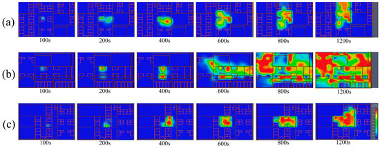 Figure 10 shows the results for unit 2: at 100 s, the temperature at the ignition point began to rise, accompanied by a noticeable appearance of smoke, which exhibited a tendency to spread to the surrounding areas. At 200 s, a flashover occurred at the ignition point, with the temperature reaching 600 degrees Celsius. The fire intensified significantly and entered a rapid development stage. Concurrently, a large amount of dense smoke was produced, spreading to the unit surrounding the ignition point. Between 200 and 400 s, the fire rapidly spread to the surrounding units. In the figure, it is evident that the fire intensified and extended to the adjacent rooms, while the temperature at the central point continued to rise. At 600 s, the fire had spread to all units of the courtyard, producing a large amount of smoke. The fire had developed from the initial ignition point to encompass the entire courtyard, resulting in open flames and substantial smoke production. Multiple combustion points emerged, with temperatures at several points reaching up to 900 degrees Celsius. As the fire continued to develop, by 800 s, the temperature consistently rose, and the high-temperature smoke generated by the combustion began to disperse, igniting flammable materials in adjacent courtyards and causing the fire to spread towards the central courtyard. The courtyards are interconnected by wooden doors, which are typically left open. The sustained high temperatures caused these wooden doors to catch fire, further facilitating the spread of the fire to other courtyards, and ultimately increasing the burned area. If measures are not promptly taken to prevent the spread of the fire, over time, the fire will eventually engulf the entire simulated area, resulting in irreparable damage.