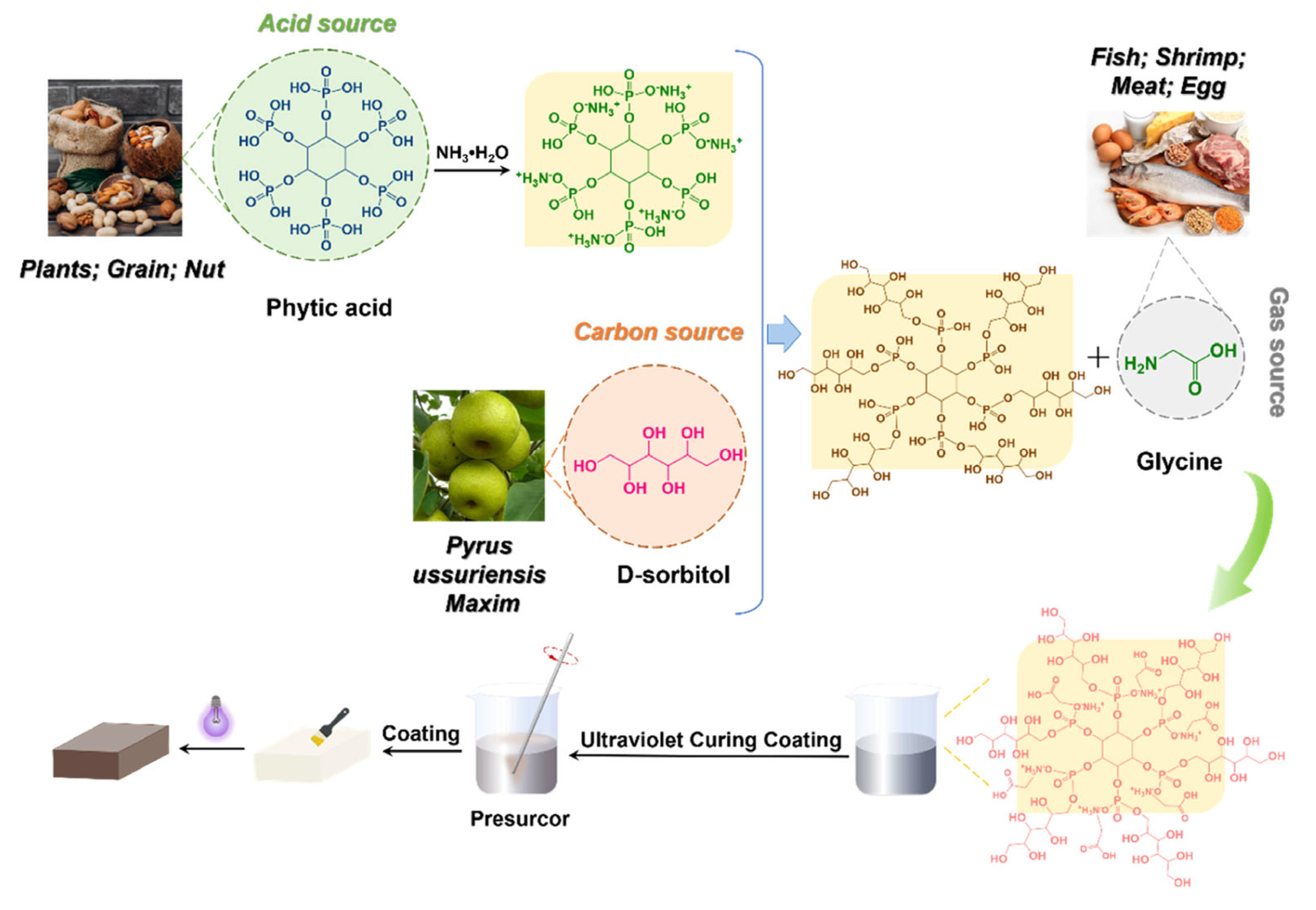 - Yu, J.; Sun, L.; Ding, L.; Cao, Y.; Liu, X.; Ren, Y.; Li, Y. A UV-curable coating constructed from bio-based phytic acid, D-sorbitol and glycine for flame retardant modification of rigid polyurethane foam. Polym. Degrad. Stab. 2024, 227, 110892. [Google Scholar] [CrossRef]