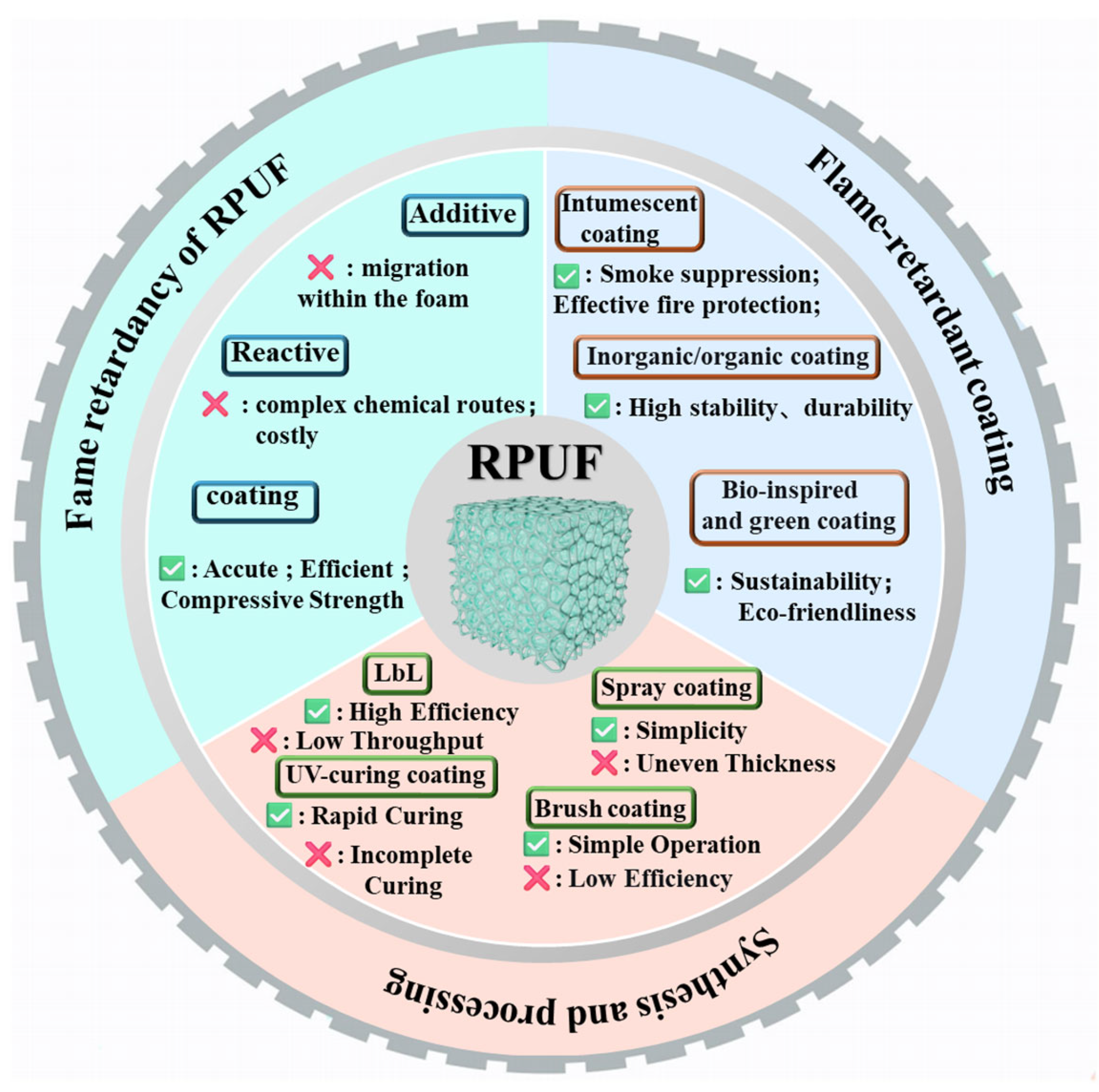 - Yuan, Y.; Lin, W.; Xiao, Y.; Yu, B.; Wang, W. Advancements in flame-retardant systems for rigid polyurethane foam. Molecules 2023, 28, 7549. [Google Scholar] [CrossRef] [PubMed]