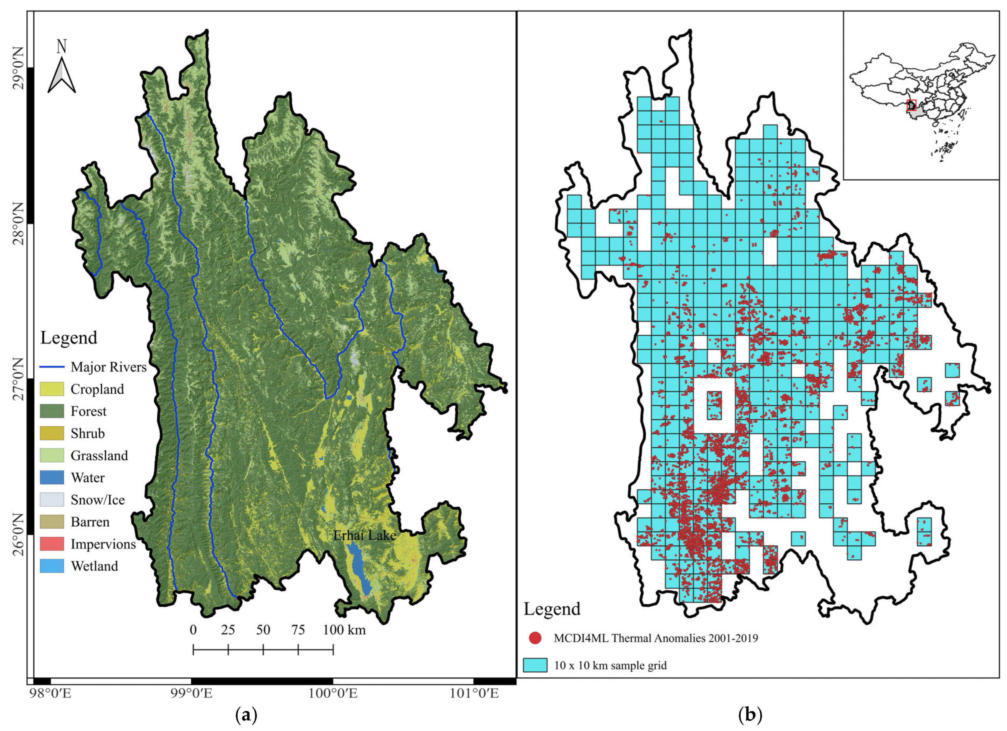 - Fornacca, D.; Ren, G.; Xiao, W. Performance of Three MODIS Fire Products (MCD45A1, MCD64A1, MCD14ML), and ESA Fire_CCI in a Mountainous Area of Northwest Yunnan, China, Characterized by Frequent Small Fires. Remote Sens. 2017, 9, 1131. [Google Scholar] [CrossRef]