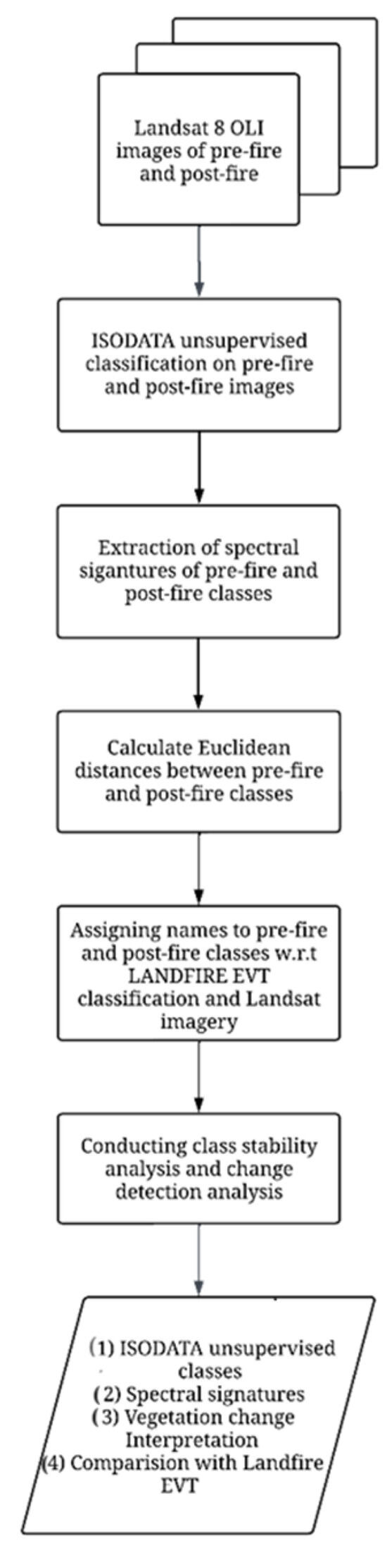 This section outlines the methodological framework employed to assess wildfire-induced vegetation changes using satellite remote sensing and ecological classification data. It details the acquisition and preprocessing of Landsat 8 imagery, the implementation of unsupervised ISODATA classification to delineate spectral land cover classes, and the extraction of spectral signatures for class comparison across time. Additionally, it utilizes the LANDFIRE Existing Vegetation Type (EVT) data and spectral signatures to label vegetation dynamics extracted from ISODATA pre-fire analysis and identify the vegetation classes. A summary of the flowchart is provided in Figure 2. While utilizing coarse resolution spectral imagery like Landsat 30 m can be debated for not being able to provide as detailed information as UAV, they are readily available and integrating with ISODATA techniques would provide more nuanced understanding of post-fire events than applying spectral indices in the most time- and cost-efficient way.