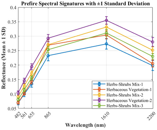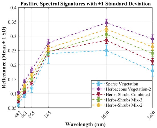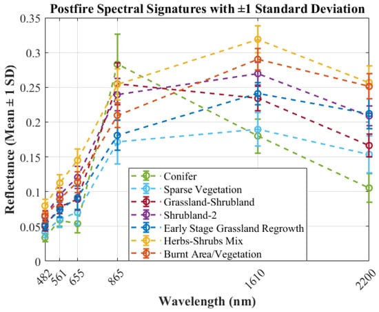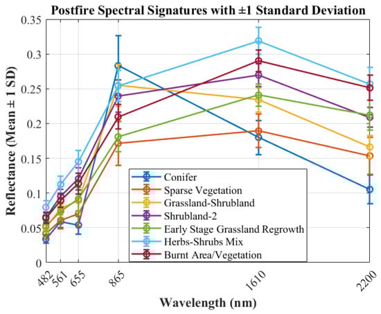 The ±1σ ranges of post-fire (Figure 8 and Table 12) show that Sparse Vegetation overlaps with Herbaceous Vegetation-1 and Herbs-Shrubs Mix-2 in the visible and NIR bands. However, it remains clearly distinct in SWIR1, ensuring reliable classification despite initial overlap.