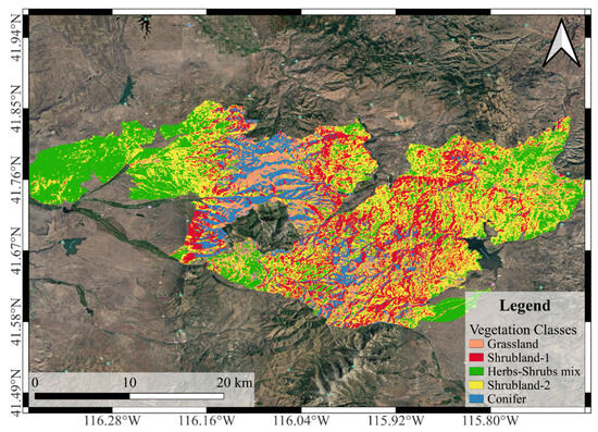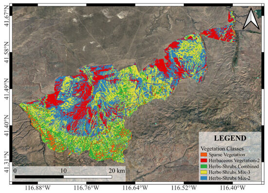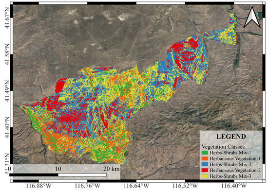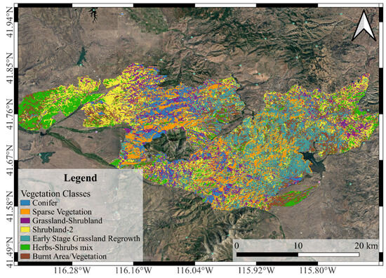 Spatially, transitions were concentrated in the central and northern portions of the burn area, where patches of Herbs-Shrubs Mix-1 and Herbaceous Vegetation-1 were largely replaced by Herbs-Shrubs Combined and Sparse Vegetation. Southern portions of the fire also showed notable conversions from Herbaceous Vegetation-2 into Herbs-Shrubs Mix-2 and Herbs-Shrubs Mix-3. Figure 9 and Figure 10 show the spatial distribution of pre-fire and post-fire classes.