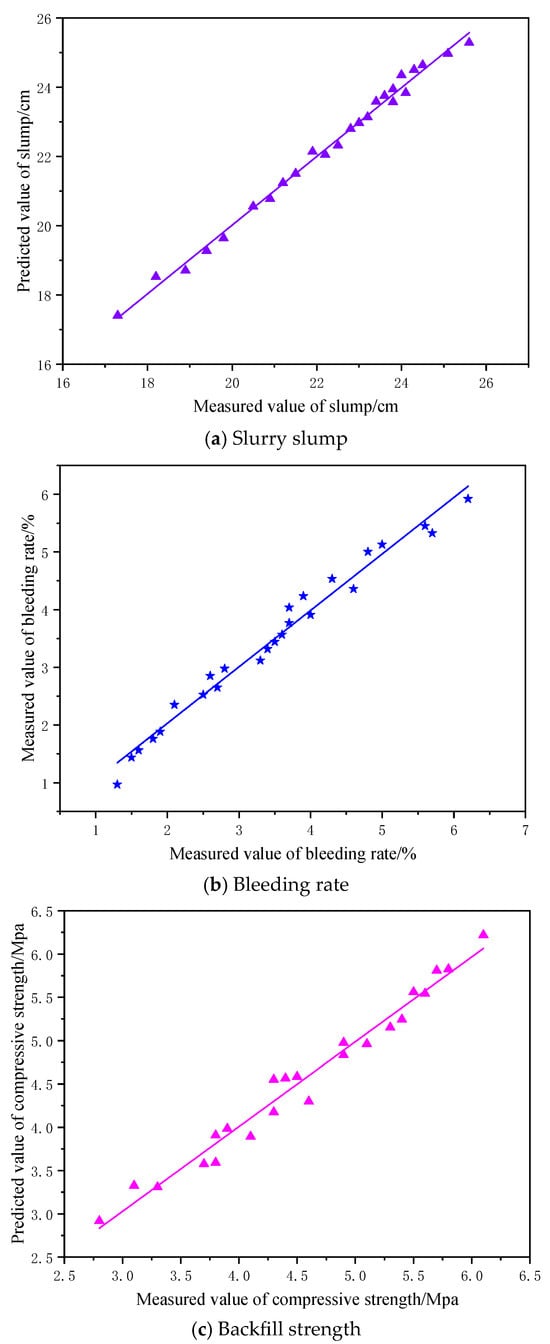 A small deviation was observed between the predicted and measured bleeding rates (2.36% vs. 2.42%, ≈2.5%). This discrepancy is mainly attributed to external factors during specimen preparation and testing: (i) minor fluctuations in ambient temperature and relative humidity, which affect hydration kinetics and early segregation; (ii) variability in manual mixing and batching (water dosing and shear history), leading to subtle differences in slurry rheology; (iii) time lag between mixing and testing, allowing partial settling or water migration; and (iv) non-uniform curing temperature among molds. To minimize such discrepancies in future tests and practical applications, several measures are recommended: (1) perform mixing and bleeding tests in a climate-controlled environment (±1 °C, RH 50 ± 5%) and use constant-temperature water baths or curing chambers; (2) implement automated batching and mixing protocols with fixed shear rate and duration, and timestamp all operations; (3) calibrate measuring devices (balances, slump cone, and cylinders) before each batch and standardize the bleeding test procedure; (4) increase the number of replicates (n ≥ 5) with randomization and blocking, and report results as mean ± SD; and (5) precondition aggregates (e.g., pre-saturate coal gangue to stabilize water demand) and verify slurry rheology immediately before testing.
