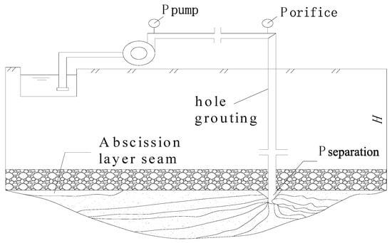 The location of the separation grouting hole and the depth of the hole can be determined according to the separation location, the development degree of the separation, and the separation range. In order to further ensure the control of the overlying strata after mining in the north area of the minefield, a certain coal mine continued to implement separation grouting and filling projects at the working faces. The grouting pressures at different positions in the separation grouting system are also different, including the following: Pseparation is the pressure in the separation zone, Porifice is the orifice pressure of the grouting hole, and Ppump is the outlet pressure of the grouting pump, as shown in Figure 7.