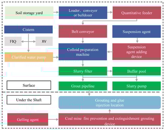 The results of fire monitoring and rock deformation observation in a certain coal mine under high-temperature conditions show that by grouting and filling the lower separation layer of the key thick strata, an active support measure, it effectively blocked the channel of heat transfer, reduced the large-scale fracture and collapse of the coal and rock mass, and lowered the risk of secondary disasters induced by fire. The results show that this technology not only reduces the possibility of structural instability and the secondary ignition of coal and rock mass under high-temperature conditions but also decreases the rate of temperature rise in high-temperature areas by about 50%. The overall process of the coal mine fire prevention and extinguishing grouting system is illustrated in Figure 8. Scholars have carried out related research on the mechanism of separation grouting in controlling the thermo-mechanical coupling effect of strata under fire conditions. They believe that the water and cementitious components in the slurry can fill the separation space, and the condensate of the slurry can form a thermal insulation support body supporting the overlying strata and roadway space, thereby delaying the spread of fire. At the same time, scholars pointed out that although a certain coal mine has adopted many measures to prevent and control fires, including advanced thermal insulation zones, microseismic and temperature monitoring, fireproof coal pillars, and insulation layers, the effect is not very good, and thermal hazards and fire risks still occur in the roadway and working face. The study found that the expansion of fractures and the thermal cracking of coal and rock masses are the main causes of mine fire development and disaster evolution. Through the regional fire prevention zoning method to divide the thermal fracture zones of the key strata, and by putting forward fireproof reinforcement measures combined with separation grouting, it can significantly improve the thermal stability and structural integrity of the surrounding rock under high-temperature conditions.