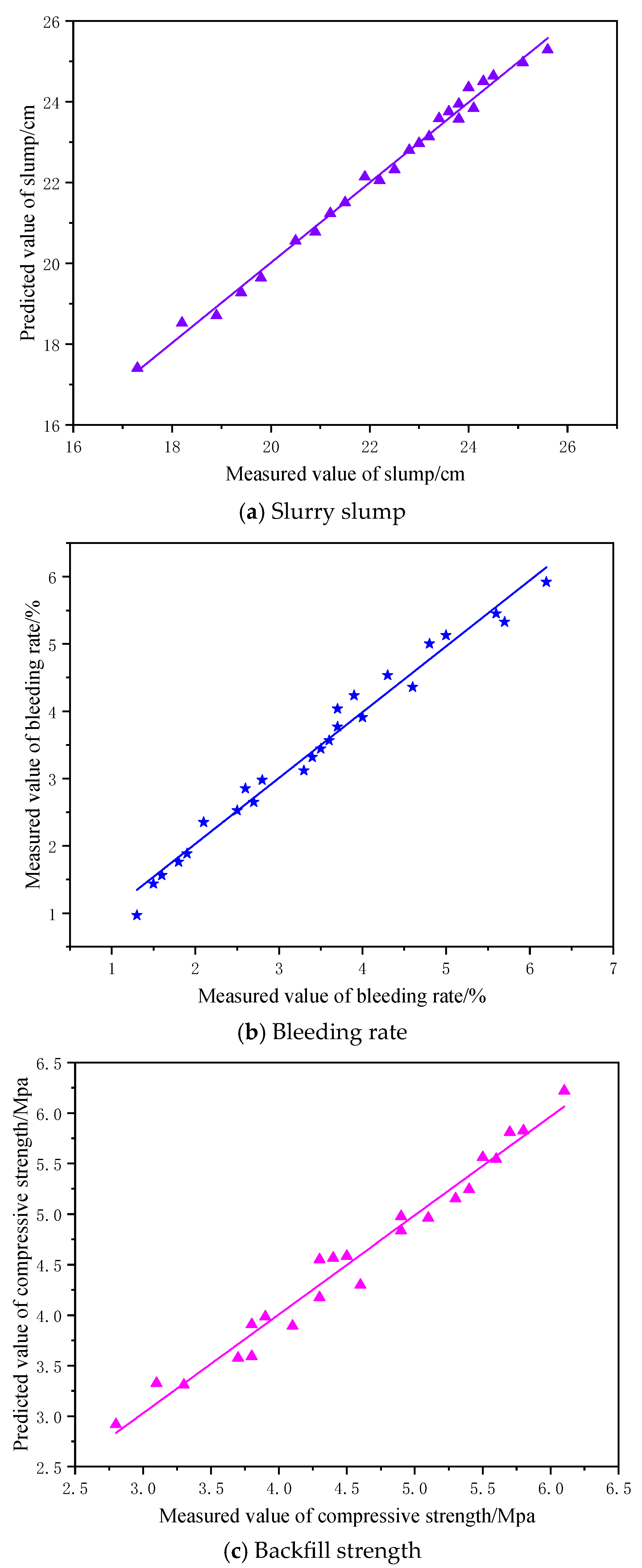 A small deviation was observed between the predicted and measured bleeding rates (2.36% vs. 2.42%, ≈2.5%). This discrepancy is mainly attributed to external factors during specimen preparation and testing: (i) minor fluctuations in ambient temperature and relative humidity, which affect hydration kinetics and early segregation; (ii) variability in manual mixing and batching (water dosing and shear history), leading to subtle differences in slurry rheology; (iii) time lag between mixing and testing, allowing partial settling or water migration; and (iv) non-uniform curing temperature among molds. To minimize such discrepancies in future tests and practical applications, several measures are recommended: (1) perform mixing and bleeding tests in a climate-controlled environment (±1 °C, RH 50 ± 5%) and use constant-temperature water baths or curing chambers; (2) implement automated batching and mixing protocols with fixed shear rate and duration, and timestamp all operations; (3) calibrate measuring devices (balances, slump cone, and cylinders) before each batch and standardize the bleeding test procedure; (4) increase the number of replicates (n ≥ 5) with randomization and blocking, and report results as mean ± SD; and (5) precondition aggregates (e.g., pre-saturate coal gangue to stabilize water demand) and verify slurry rheology immediately before testing.