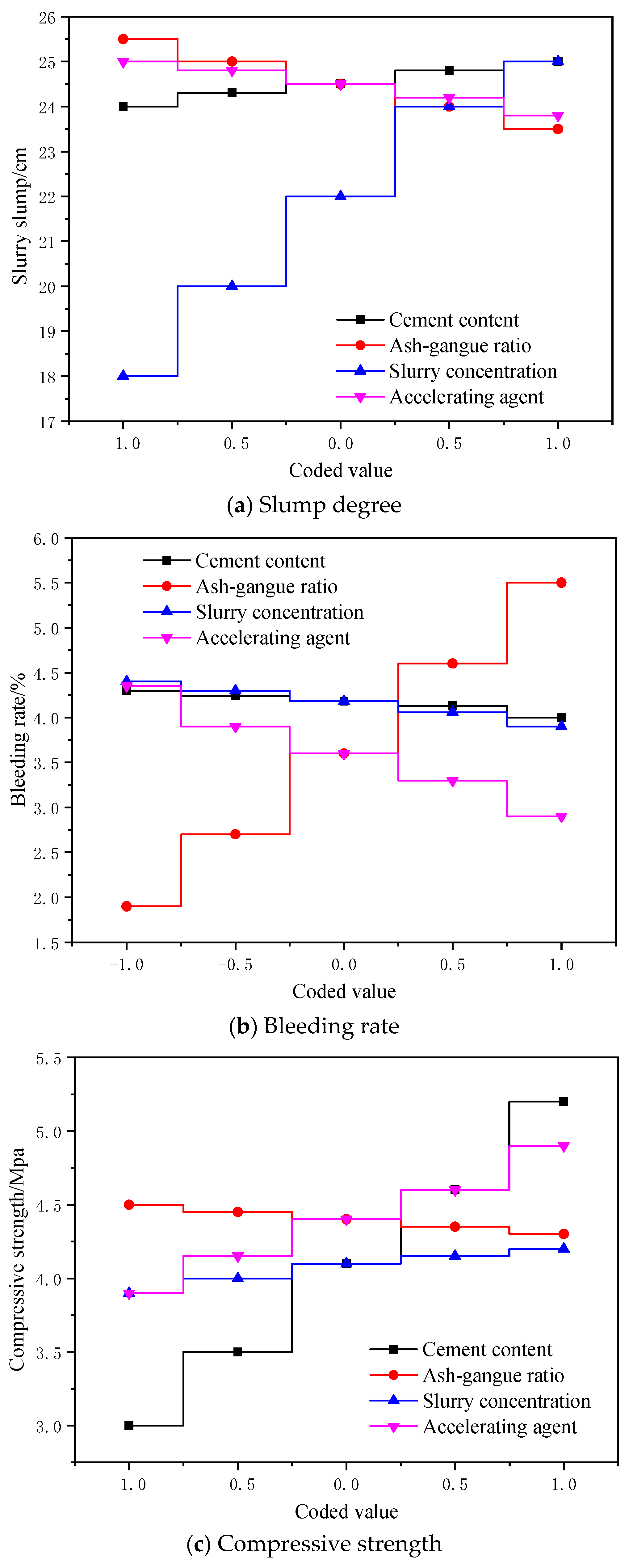Table 2 that the slump degree, bleeding rate, and compressive strength are not only affected by individual factors but also by the interaction of various factors. Among them, the slump degree is not significantly affected by the simultaneous action of multiple factors, and the bleeding rate has a significant effect on compressive strength.