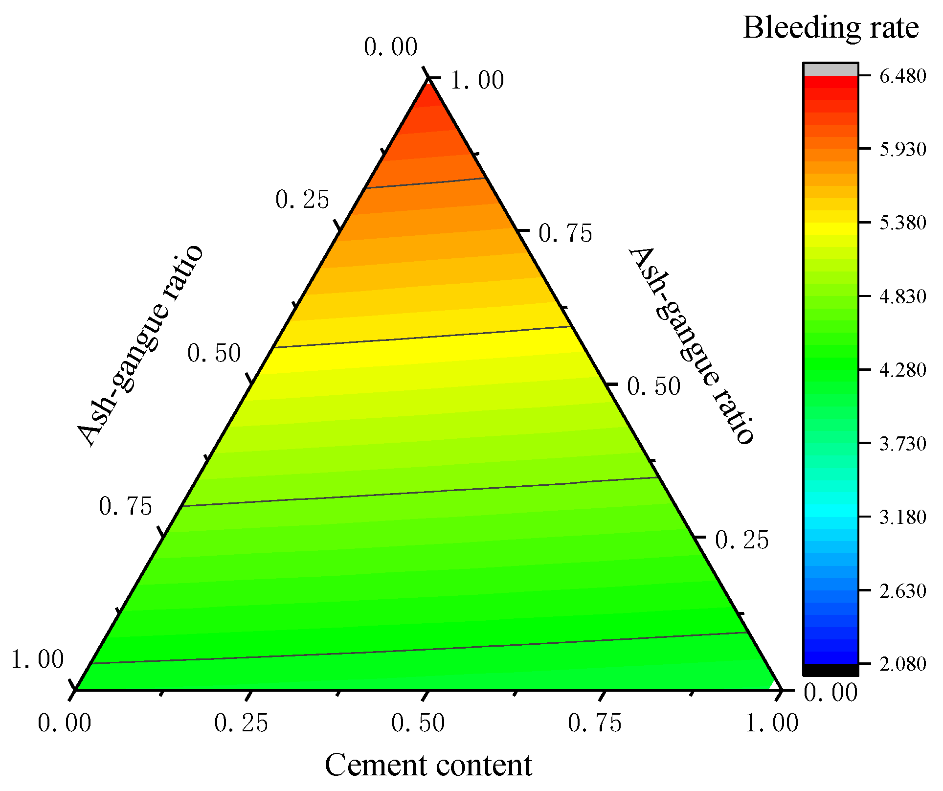 23]. However, increasing the amount of cement used in coal mine filling and mining will significantly increase the cost of filling. Therefore, as long as the mechanical properties of the filling body meet the requirements, the amount of cement should be reduced as much as possible to reduce the material cost. The single factor of the bleeding rate is shown in