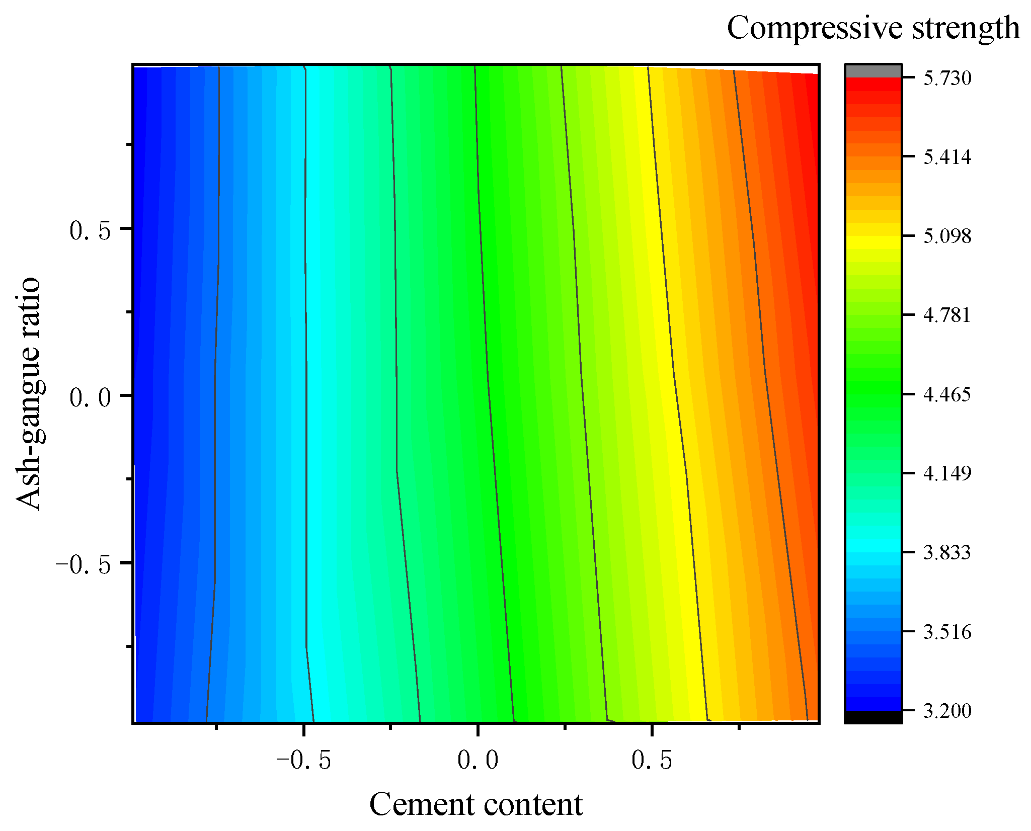 Figure 4 shows the influence of the slurry concentration of 54.19% and the grouting admixture of 3.00%, an interaction of the cement content and ash ratio on the compressive strength. It can be seen from
