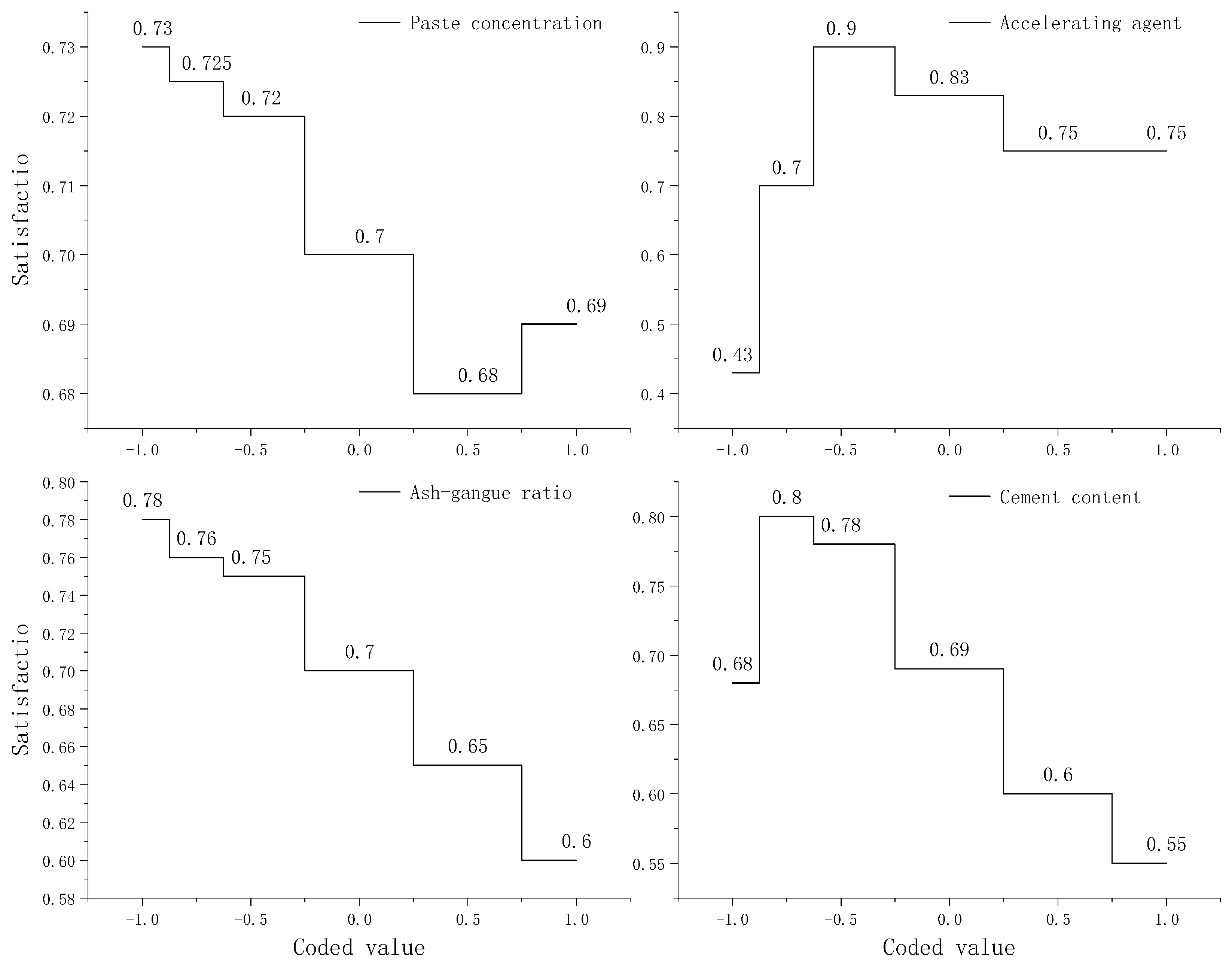 Figure 5 that the cement content has a significant effect on the overall satisfaction of the filling performance, the satisfaction is between 0.5 and 0.8, the trend is to increase first and then decrease, and the cement content is between 5% and 7%, which can achieve a greater satisfaction. When the pulp concentration is between 52% and 57%, it has little effect on satisfaction, but it has been maintained between 0.6 and 0.8 to maintain greater satisfaction. When the gangue ratio is in the range of 0.5~2, satisfaction decreases slightly, and when the gangue ratio is 0.5, the satisfaction can reach 0.8. The grouting admixture has a significant impact on overall satisfaction in the range of 1% to 5%, and satisfaction shows a trend of increasing first and then decreasing. When the grouting admixture is between 1.3 and 1.5, satisfaction can reach 0.9, which means that the grouting admixture needs an appropriate amount, and excessive admixture will not only increase the filling cost but also reduce the filling quality. The optimal fire protecting and filling material ratio fitted by Matlab data is a cement content of 12.12%, ash–gangue ratio of 0.5, slurry concentration of 52%, and grout admixture of 1.49%, and the corresponding response is a slump of 28.5 cm, bleeding rate of 2.36%, and the filling body strength is 4.62 MPa.