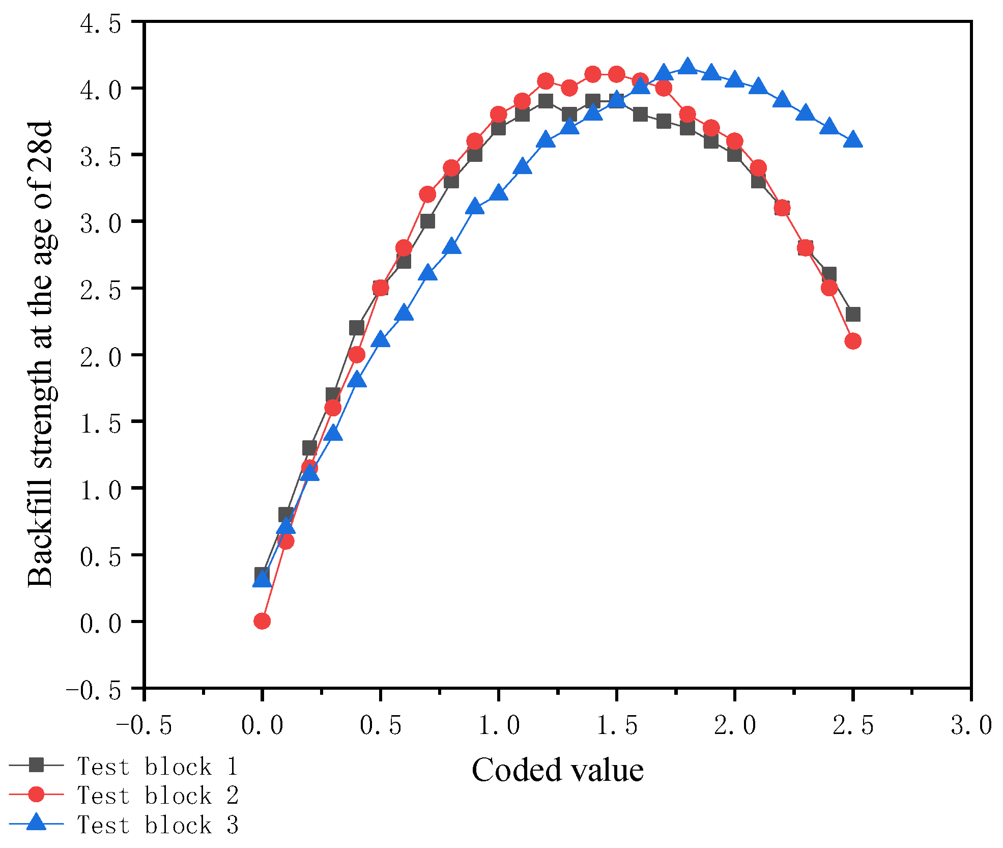 In order to ensure the reliability of the experimental results, according to the optimized data obtained from the analysis, under the same experimental conditions, a verification test was conducted. The weight is a total of 5 kg of grouting material, of which 566.6 g is cement, 2355.6 g is materials, 1265.4 g is fly ash, 700 g is coal gangue, and 112.4 g is grouting admixture. The material experiment shows that the slump is 28.14 cm, which is basically consistent with the actual value. The bleeding rate is 2.42%, which is higher than the theoretical value, and the error is about 2.5%, which may be caused by external interference factors. The compressive strength of the filling body at 28 days of age is 4.47 MPa, and its value is shown in