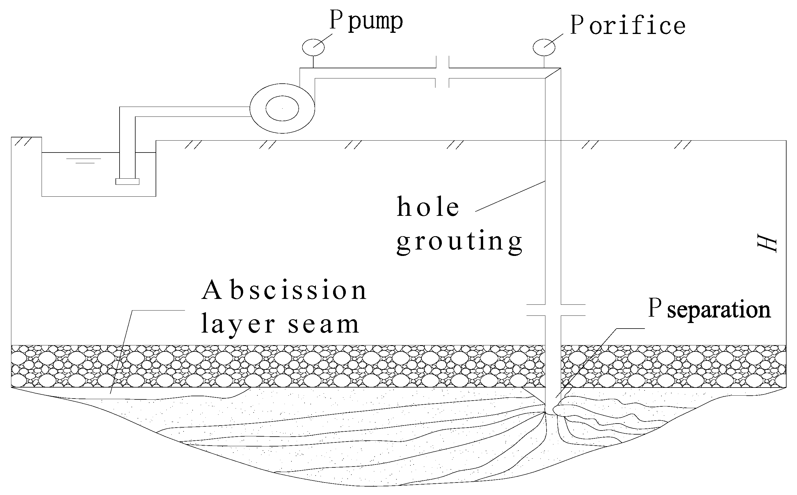 In this formula, hf is the resistance of the slurry pipeline; γ slurry is the bulk density of the slurry; and H is the separation depth. According to Formulas (7) and (8), the grouting pressure in the separation layer is related to the resistance of the slurry pipeline, the bulk density of the slurry, and the development degree of the separation layer. Take the 10-2# grouting hole in a certain coal mine as an example. When the working face is mined 50–80 m away from the orifice, the orifice pressure drops significantly, indicating that the separation layer is well developed. When the separation layer is fully developed and the orifice pressure drops to the lowest pore pressure of 1.2~2 MPa (usually for 150–180 days), it is a favorable opportunity for grouting, and the amount of grouting should be increased. When the grouting hole is about 300 m past the working face, the orifice pressure begins to rise significantly and gradually approaches the initial injection pressure of 3.8~4 MPa, indicating that the separation has become closed and stable.