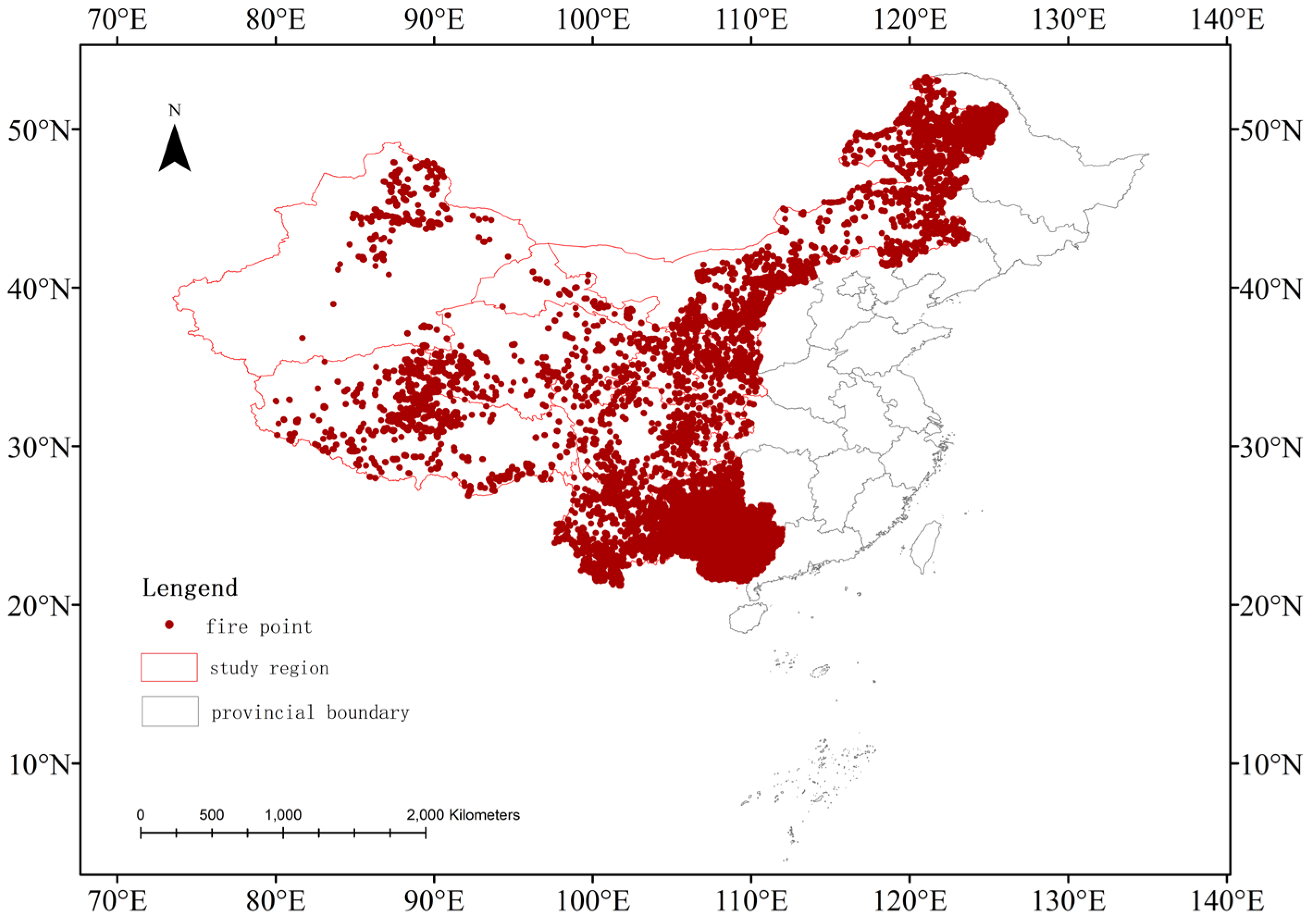 In recent years, the forest area in China has increased from ∼154 Mha in 2000 to ∼248 Mha in 2022, in which the western regions of China dominate the increasing forest area [28]. Vegetation fires are frequent in western China due to various causes. This study region includes the provinces of Inner Mongolia, Guangxi, Chongqing, Sichuan, Guizhou, Yunnan, Tibet, Shaanxi, Gansu, Qinghai, Ningxia, and Xinjiang, which cover an area of 6.867 million km2 and account for 71.5% of China’s total land area (Figure 1). In government administration, Inner Mongolia is taken as a part of West China, although geographically, the eastern part of this province is considered part of Northeast China. Regions such as Yunnan and Guizhou, with dense forests and intensive anthropogenic activities, experience high incidences of human-caused fires [29]. In Inner Mongolia, lightning-induced fires are prevalent and have increased in recent years [30]. Qinghai and other inland regions with scarce precipitation are prone to vegetation fires during dry seasons [31]. Spatial clustering analysis can facilitate the identification of vegetation fires which share similar causing factors. The clustering results can support the formulation of targeted preventive strategies to mitigate economic and ecological risks.
