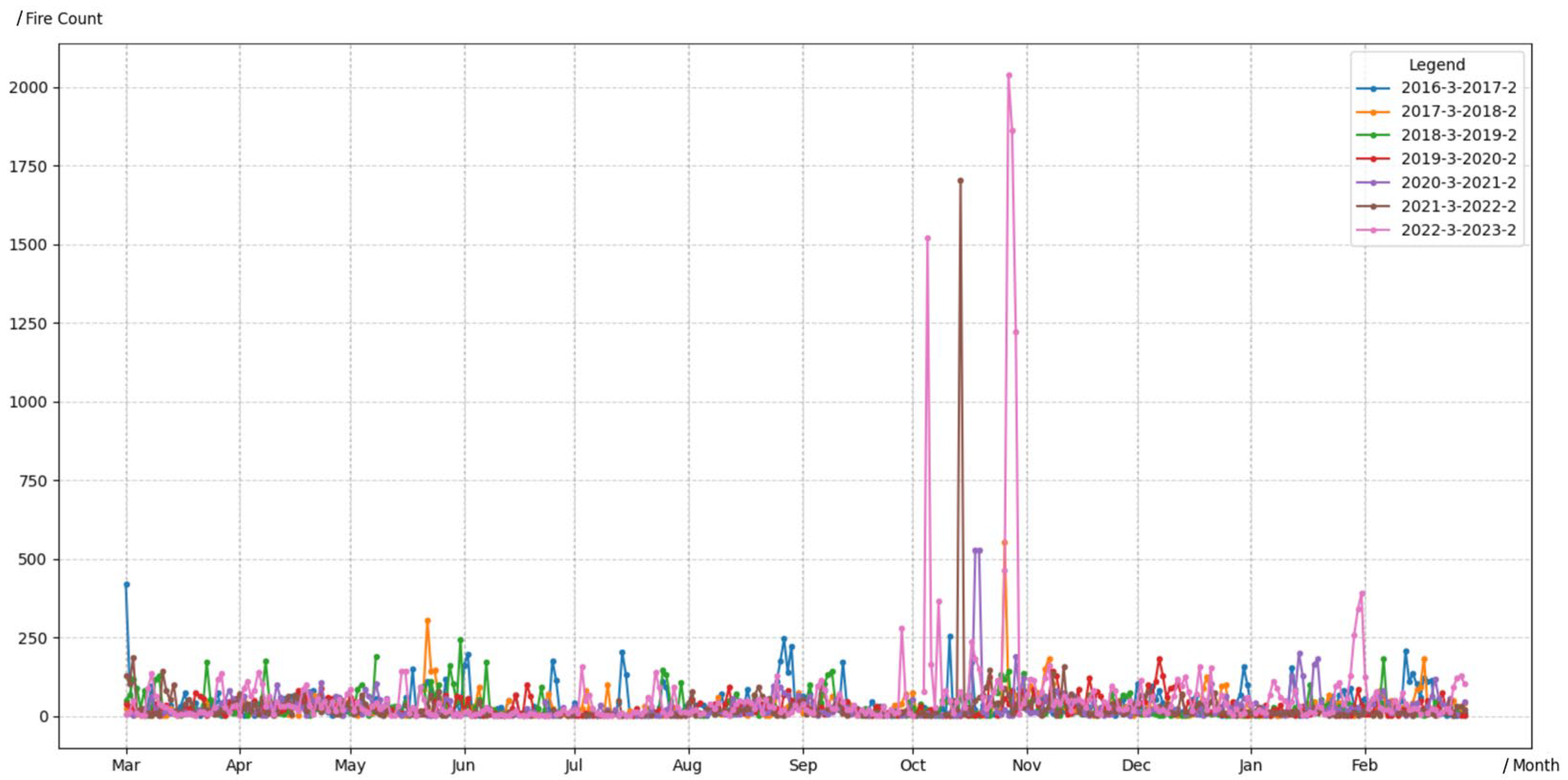 This study uses vegetation fire data from Himawari-8, a satellite launched by Japan in July 2015. Compared to other fire data acquired by remote sensing satellites, such as MODIS and Sentinel 3, Himawari-8 offers higher temporal resolution up to 10 min, which can detect vegetation fires lasting a shorter time [32,33,34]. The dataset includes fire points with attributes such as time, geographic coordinates, fire point level, and confidence level. Fire point levels are classified as Level 1 (cooling), Level 2 (smoldering), and Level 3 (burning). Confidence levels are categorized as Level 1, Level 3, and Level 5, determined by factors such as solar radiation and brightness temperature. This study uses fire Level 3 (burning) and confidence Level 5 (highest confidence) [33,34] to filter fire points from 2016 to 2022, resulting in 84,330 fire points. There are 28,381 fire spots with non-repeating longitude and latitude coordinates. Figure 1 shows the study region and spatial distribution of fire points. Figure 2 presents daily fire point statistics, which show high fire incidence in the fall.