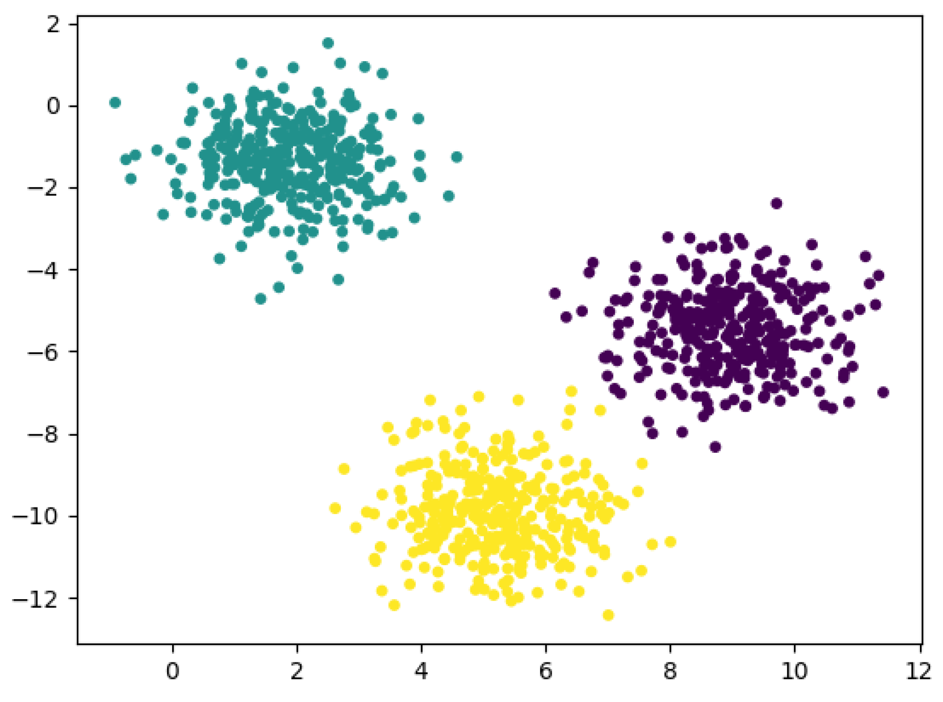 To validate the proposed DBSCAN with GA optimized threshold values, A synthetic test dataset following a Gaussian distribution was generated, comprising 1000 sample points forming three distinct clusters with an intra-cluster standard deviation of 1.0 (Figure 3). The dataset was constructed using the make_blobs function, a core dataset generation utility within the scikit-learn library [35]. This tool is specifically designed to produce synthetic datasets consisting of one or more “blobs”, where data points in each blob adhere to a simple probability distribution—namely, the multivariate Gaussian distribution here. The mathematical foundation of make_blobs relies on the multivariate Gaussian distribution. For a blob k (with k = 3 in this study) in a d-dimensional feature space (where the number of features corresponds to the dimensionality; for consistency with coordinate representation, this study uses d = 2, i.e., two-dimensional data), the data generation process is formally defined as follows: