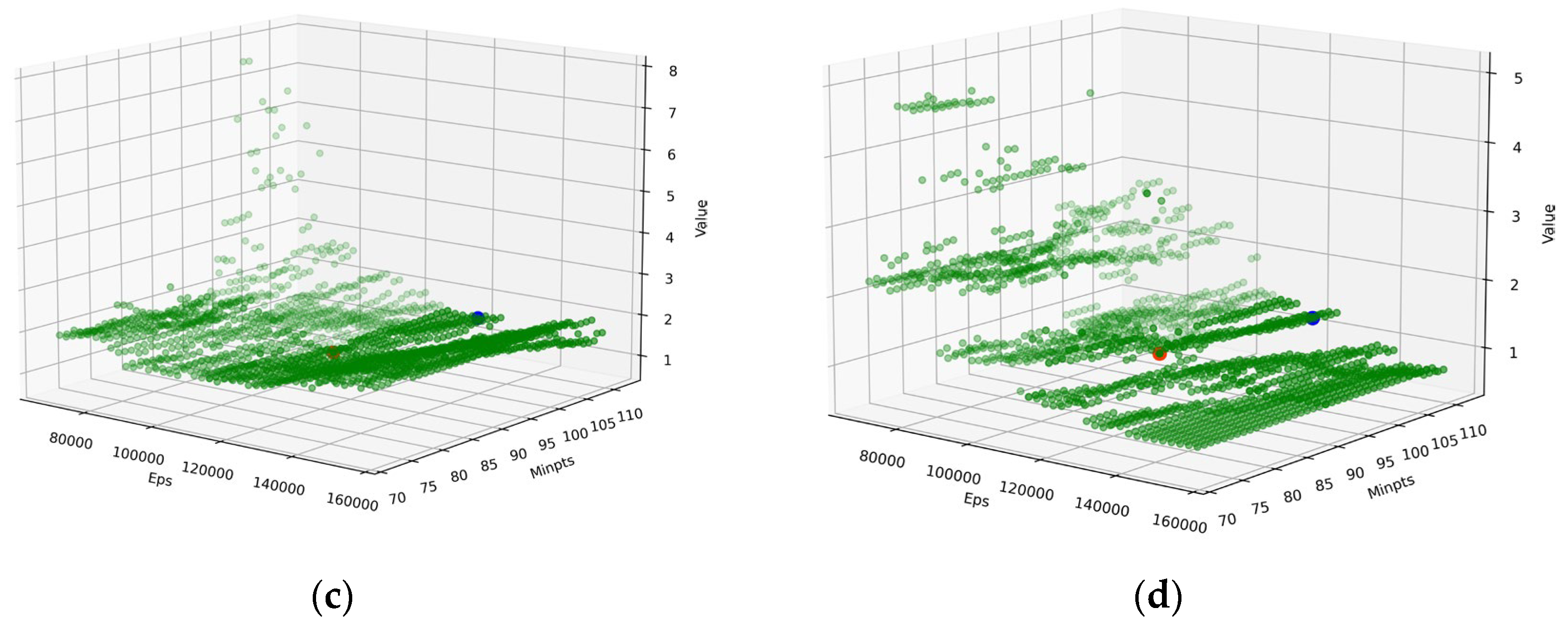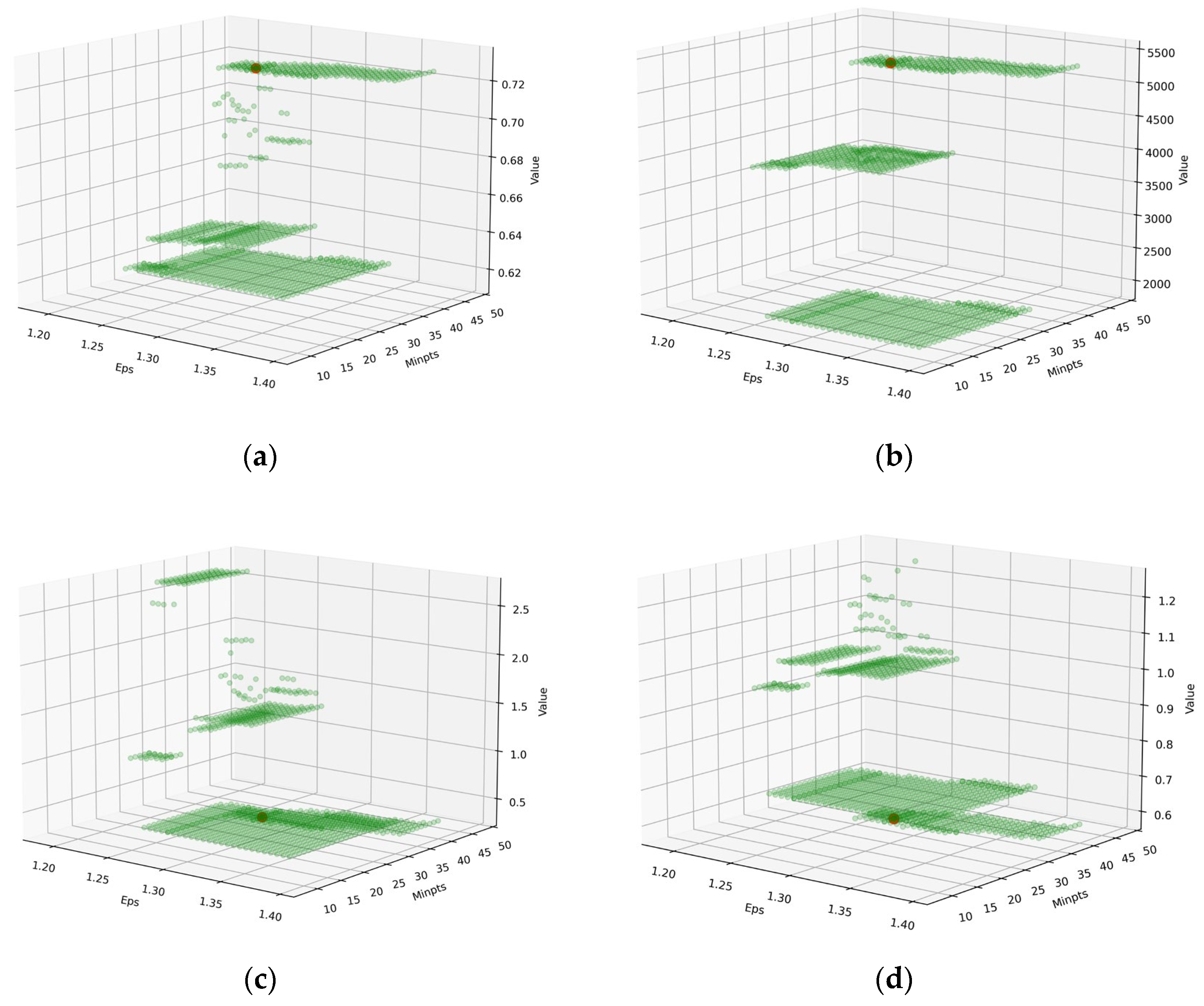 Figure 5. Test dataset scatter plot of thresholds evaluation: (a) silhouette index; (b) Calinski–Harabasz index; (c) Davies–Bouldin index; (d) SD (Scattering/distance) validity index.