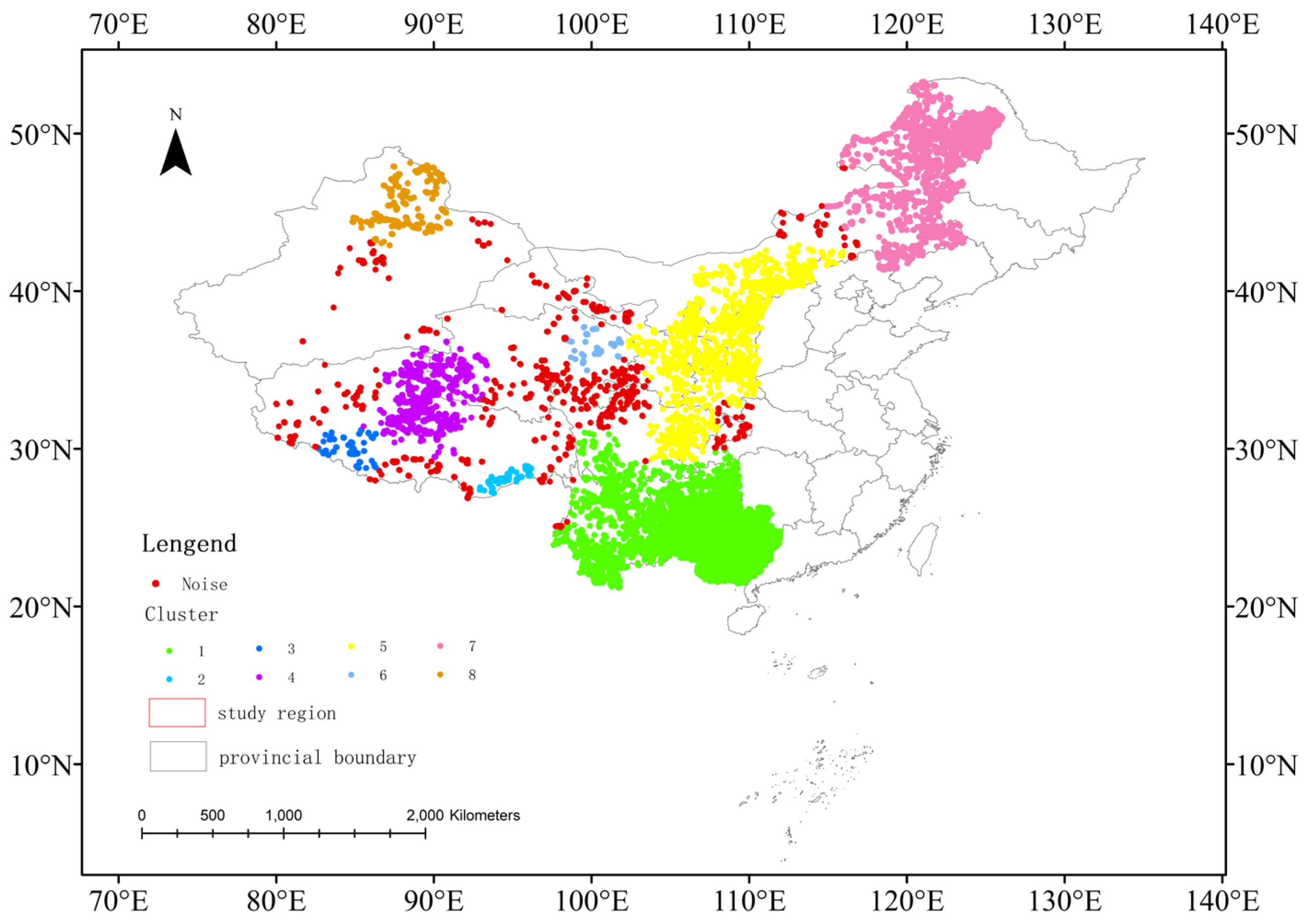 The dataset incorporates multi-year fire detection records, containing instances of fire points detected at identical geographic coordinates across different temporal observations. To optimize computational efficiency, only the first fire occurrence point remains, and other duplicate fire points sharing identical spatial coordinates are removed during preprocessing. After optimizing the threshold selection, the resulting Eps is 111,538, and MinPts is 92. The total number of clusters is 8, with 1250 noise points. The clustering results are shown in Figure 6.