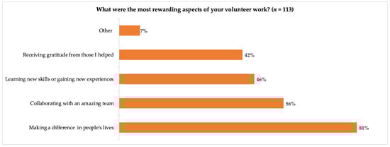 Survey findings indicate that the majority of responders were driven by a strong sense of community service (Figure 1). Many respondents expressed a desire to help the community: 93% (95% CI = 86.6–96.4%) and found the most rewarding aspects of their experience (Figure 2) to be making a difference in people’s lives: 81% (95% CI = 72.3–86.8%) and collaborating with a valued team: 56% (95% CI = 46.6–64.6%). Some responders also highlighted the opportunity to learn new skills/gain experience: 46% (95% CI = 37.1–55.2%).