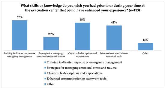 Opportunities for improved training and knowledge-sharing emerged as another key theme, with responders expressing a need for better preparedness in future disaster responses. In response to the question on what skills or knowledge responders expressed a desire for training in disaster response or emergency management (52%; 59/113) 95% CI = 43.1–61.2%. (Figure 6). One responder emphasized the importance of ongoing updates, requesting “updates on how people are doing in the shelters, any improvements in infection rates, etc.” Others suggested that AltaMed formalize lessons learned, proposing that the organization take the lead in “drafting a guide of what was learned during COVID-19 and fire so that we have a resource for the future.”