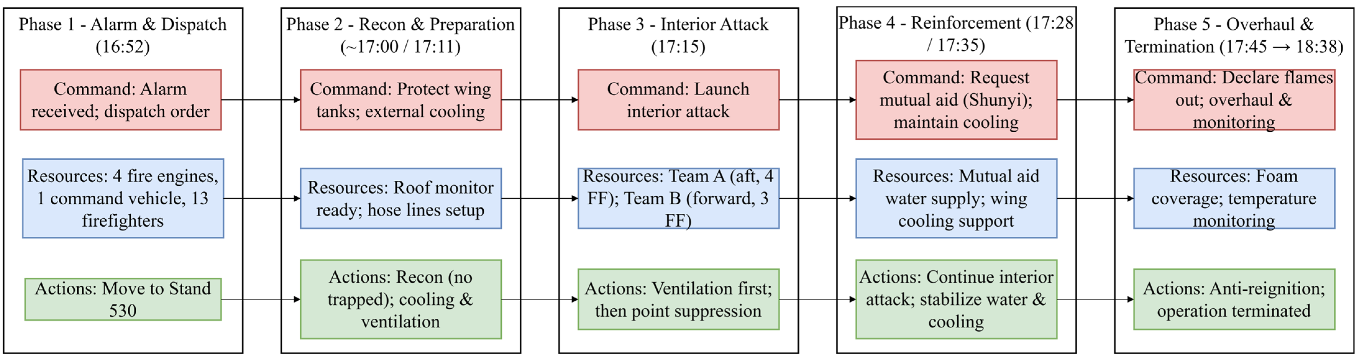 According to the firefighting operation records from Beijing Capital International Airport, the suppression process can be divided into five main phases (see