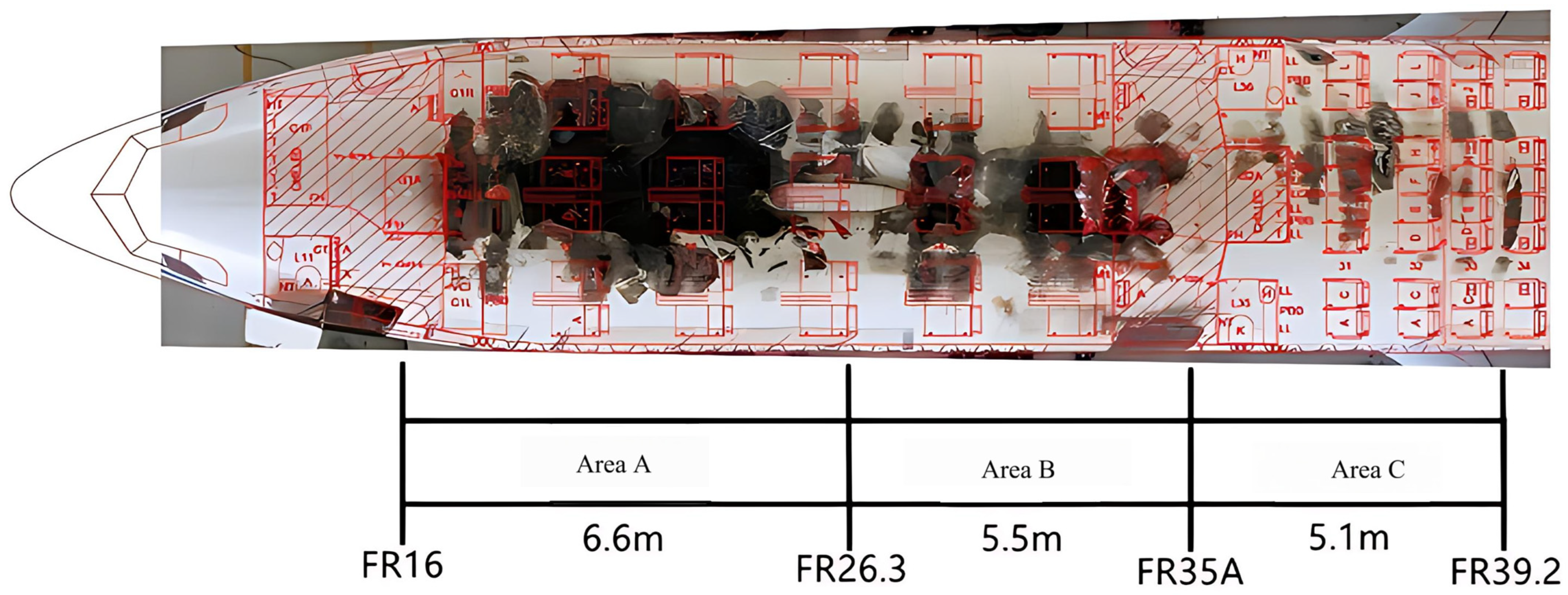 In the core inspection, the main damage was concentrated between fuselage stations FR16–FR39.2 longitudinally and S22L–S20R laterally. Burn patterns showed significant heterogeneity: Area A displayed burn-through holes, suggesting localized high-temperature penetration; Area B exhibited both burn-through and severe skin deformation, indicating the most intense fire activity; while Area C was relatively less affected, showing only surface charring (see